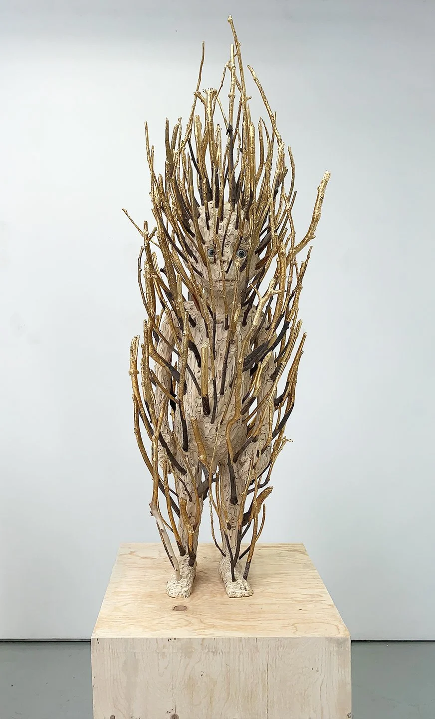 Sentinel I, 2022. Plywood, found wood, metal leaf, glass eyes, 50” x 15” x 15”